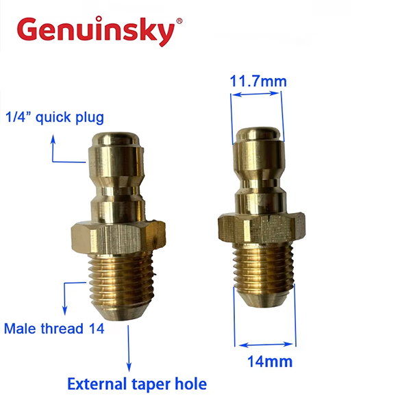 Dit is 1/4 inch koperen snelle release -plug -fittingen. Het product zelf heeft een 1/4 "mannelijke draad extern taps toelopende gat, en dit uiteinde is mannelijk voor AD 14, de diameter is 14 mm. Het andere uiteinde is een 1/4" snelle plug met een diameter van 11,7 mm.