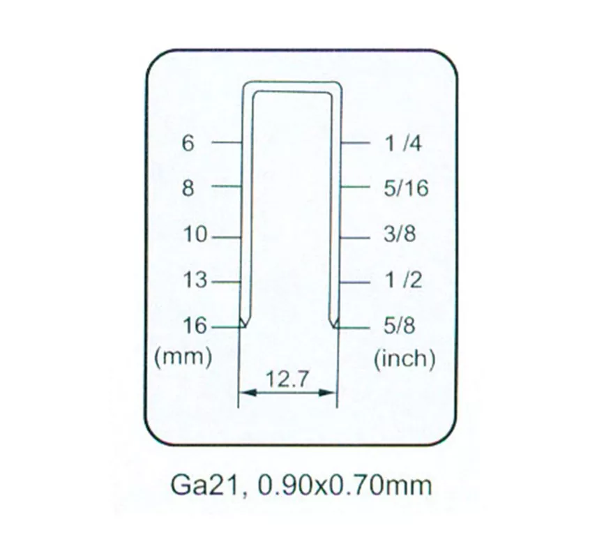 8016-serie luchtvaartuigen omvatten voornamelijk 8016B luchtfijne kroon, 8016C lucht fijne kroon nietje, 8016ln (lange neus) luchtfine kroon, allemaal klassieke zware lucht nagelpistolen. Geschikte nagel GA21, 0,90x0,70 mm, schouderafstand 12,7 mm, nagelhoogte kan 6 mm, 8 mm, 10 mm, 13 mm, 16 mm (1/4, 5/16, 3/8, 1/2, 5/8 inch) zijn.