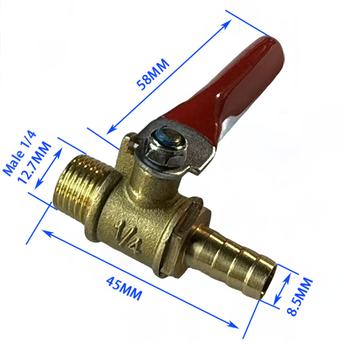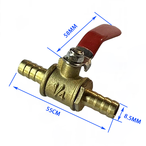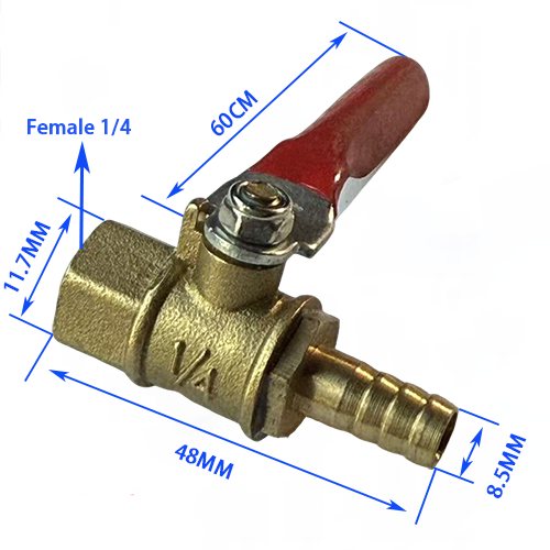 5. Binnendraad + pagodemodel, het ene uiteinde van het product is binnendraad 1/4, met een diameter van 11,7 mm, en het andere uiteinde is een pagodekop van 8,5 mm, de totale lengte van het kleplichaam is 48 mm en de lengte van de handgreep is 60 mm, wat voornamelijk geschikt is voor de binnendraadinterface van de luchtcompressor en de overdracht van de slang.