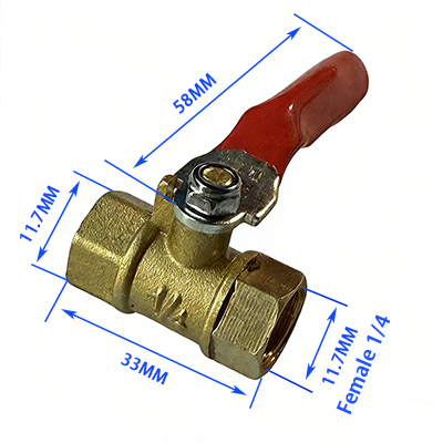 4. Type dubbele binnendraad, beide uiteinden zijn binnendraad 1/4, de diameter is 11,7 mm, de totale lengte van het kleplichaam is 33 mm en de lengte van de hendel is 58 mm, die kan worden aangepast aan de pijpleidingaansluiting van de smalle interne ruimte in de apparatuur.