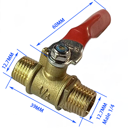 6. Model met dubbele buitendraad, de productuiteinden zijn buitendraad 1/4, de diameter is 12,7 mm, de totale lengte van het kleplichaam is 39 mm en de lengte van de hendel is 60 mm, die voornamelijk wordt gebruikt voor het aankoppelen van harde pijpen van het hoofdcircuit van de luchtcompressor.