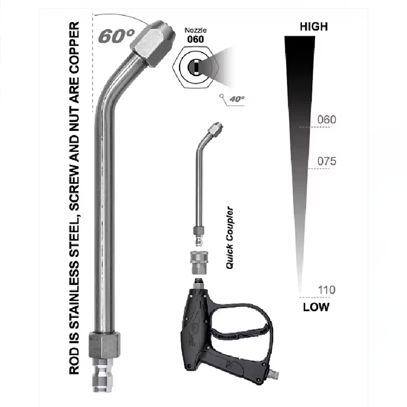 Het maatontwerp van dit gebogen mondstuk is nauwkeurig, gebogen 60 graden, met het ontwerp van het uitlaatgatdia.060 40 graden, dit speciale hoekontwerp kan gemakkelijk in de smalle interne ruimte van de airconditioner komen voor het reinigen. De bewerking kan zeer flexibel zijn. De spuitmondspecificatie is 060 en de hoek van het mondstuk is 40 graden, zodat deze een geschikte waterstroom kan vormen voor het spoelen in de reinigingsbewerking. Nilfisk en WAP zijn zeer beroemde merken schoonmaakapparatuur. Deze twee merken waskanonnen hebben een stabiele hogedruk waterstroom en kunnen het reinigen nauwkeurig regelen, zodat ze in veel scenario's veel worden gebruikt bij het reinigen van werkzaamheden. Het gebogen mondstuk van Juinsky past op WAP/Nilfisk -pistool, zodat het de airconditioner gemakkelijk kan reinigen met de samenwerking van beide partijen en het stof en vuil in de airconditioner efficiënter kan reinigen. Op tijd reinigen van de airconditioner is niet alleen voor mensen, het is goed voor de gezondheid en kan ook de levensduur van de airconditioner zelf verlengen.