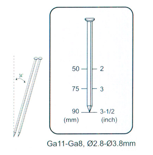 De nagelspecificaties zijn GA11-GA8, met diameter 2,8-3,8 mm en lengtes typisch van 50 mm, 75 mm en 90 mm (2-inch, 3-inch, 3-1/2-inch). De hellingshoek van de nagelopstelling is 34 graden. De nageldiepte kan worden aangepast volgens de werkbehoeften.