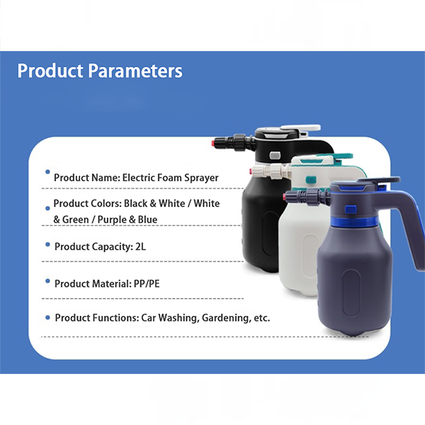 Electric Foam Sprayer-producten hebben zelf veel voordelen. Ten eerste: elektrisch opladen, spuiten met één klik. Dankzij het elektrische druksysteem kan het spuitwerk met een lichte druk worden uitgevoerd. Of het nu gaat om het bewateren van bloemen en planten in de tuin, het produceren van schoon schuim bij het schoonmaken van auto's, of het desinfecteren en schoonmaken in huis, met elektrische supercharger kunnen gebruikers gelijkmatig spuiten met één klik op het werk, waardoor het spuitwerk tijd- en moeitebesparend wordt en de werkefficiëntie wordt verbeterd. Handmatig persen vereist herhaaldelijk persen, wat niet alleen vermoeiend is, maar ook weinig werkefficiëntie oplevert. Ten tweede is de levensduur van de batterij langer en kan deze na één keer opladen ongeveer 30-45 minuten worden gebruikt. Dit uithoudingsvermogen kan zonder onderbreking tijdens het werkproces worden gebruikt en kan het tuinieren, bewateren of autopoetsen in één keer voltooien, wat ook nuttig is om de efficiëntie te verbeteren. Ten derde kan de sterke elektrische druk van het product het reinigings- of desinfectiemiddel volledig emulgeren en is het geproduceerde schuim dichter. Bij autoschoonmaak kan het dichte schuim dieper in de scheuren van de autolak dringen, waardoor het vuil gemakkelijker uiteenvalt. Bij irrigatiewerkzaamheden in de tuinbouw kan het, als de voedingsoplossing schuimig is, gemakkelijker in contact komen met de planten. Tegelijkertijd wordt het onder een brede hoek gespoten, zodat het volledig in contact komt met de planten. Ten slotte betekent het delicatere schuim bij het desinfecteren en reinigen van de woning dat het contactoppervlak kan worden vergroot, waardoor het desinfectie- en reinigingswerk grondiger wordt. Vergeleken met de traditionele handgeperste spuit zorgt de onvoldoende handmatige druk ervoor dat het schuim dun en ongelijkmatig is, wat het reinigende en desinfectieeffect sterk beïnvloedt. Ten vierde: maak het fleslichaam dikker en upgrade het materiaal, zodat gebruikers het met meer gemak kunnen gebruiken. Het product zelf is gemaakt van PP/PE-materiaal om een verdikt fleslichaam te maken. De verdikking van het fleslichaam maakt de elektrische schuimsproeier duurzamer en niet gevoelig voor beschadiging. Ten slotte zijn de ontwerpdetails van de functionele delen van het product professioneler en menselijker. De Type-C-oplaadpoort kan bijvoorbeeld compatibel zijn met reguliere oplaadapparaten, waardoor opladen gemakkelijker wordt. Het overdrukventiel kan de gebruiksveiligheid garanderen en het schuimmondstuk kan het spuitbereik nauwkeurig regelen, waardoor groothoekspuiten en spuiten met een vast punt gemakkelijk kan worden voltooid.