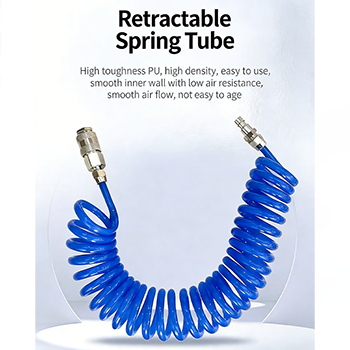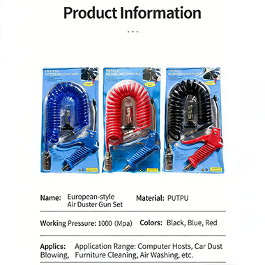 telescopische veerluchtpijp in het pak is gemaakt van PU-materiaal en er zijn drie kleuren om uit te kiezen: zwart, blauw en rood. De binnenwand van het zeer sterke PU-materiaal is glad, waardoor de windweerstand lager is en de luchtstroom soepeler zal zijn. Tegelijkertijd heeft PU-materiaal een uitstekende slijtvastheid en verouderingsbestendigheid, en de werkdruk kan 1000 Mpa bereiken, wat kan zorgen voor een sterke luchtstroom bij stofverwijderingswerkzaamheden, waardoor stofverwijderingswerkzaamheden efficiënter worden. Ook de snelkoppelingen aan beide uiteinden van de luchtpijp zijn zeer praktisch. Voor het plug-in-ontwerp is geen gereedschap nodig en de verbinding met het luchtpistool en de luchtbron kan binnen enkele seconden worden voltooid, wat de werkingsefficiëntie aanzienlijk verbetert.