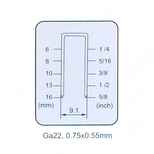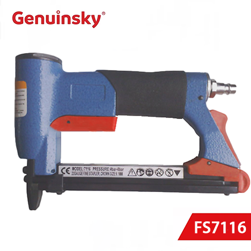 FS7116 Air Fine Crown Stapler zijn klassieke zware lucht nagelpistolen. Geschikte nagel GA22, 0,75x0,55 mm, schouderafstand 9,1 mm, nagelhoogte kan 6 mm, 8 mm, 10 mm, 13 mm, 16 mm (1/4, 5/16, 3/8, 1/2, 5/8 inch) zijn.