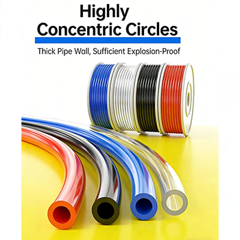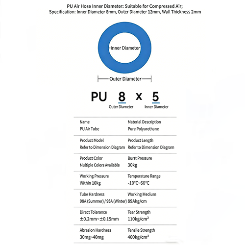 Allereerst is de zeer zuivere PU explosieveilige luchtslang, vanuit de kernparameters, speciaal ontworpen voor persluchttransmissie. De kernspecificatie van het product is PU 8×5 (binnendiameter 8 mm, buitendiameter 12 mm, wanddikte 2 mm), die zich kan aanpassen aan de interfacebehoeften van de meeste pneumatische gereedschappen en automatiseringsapparatuur op de markt. De eigen, zeer concentrische structuur kan zorgen voor een stabiele overdracht van de luchtstroom, en tegelijkertijd kan het ervoor zorgen dat de luchtpijp zelf een betere explosieweerstand heeft. Op het gebied van de autoproductie en de assemblage van elektronische componenten zijn de veiligheids- en stabiliteitseisen voor pijpleidingen relatief hoog, dus de stabiliteit van de luchtpijp is erg belangrijk.