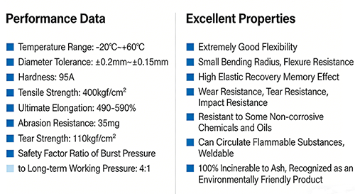 Tegelijkertijd is de hardheid van het product 95A, kan de treksterkte 400 kgf/cm² bereiken, is de breukrek 490% -590% en is de scheursterkte 110 kgf/cm², wat niet alleen ondersteunend is, maar ook een uitstekende flexibiliteit heeft. Het is bestand tegen veelvuldig buigen en trekken tijdens gebruik, waardoor de productie van het product duurzamer is, wat de levensduur van het product aanzienlijk verlengt.