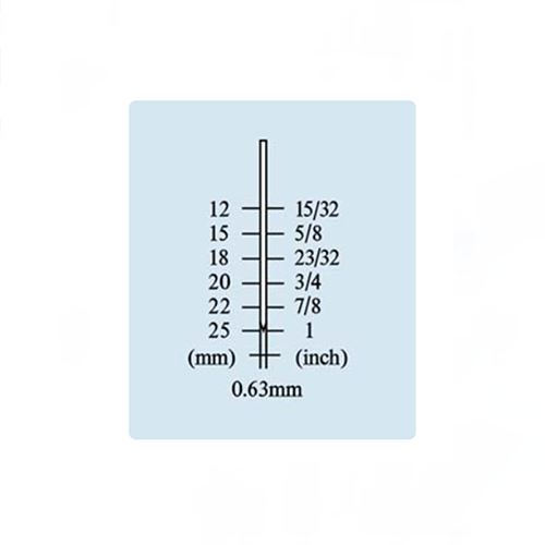 De nagel- of pin-maat voor MP625A Air Micro Pinner is klein en dun, maat 12-25 mm (15/32 tot 1 inch), GA23, DIA. 0,63 mm.
