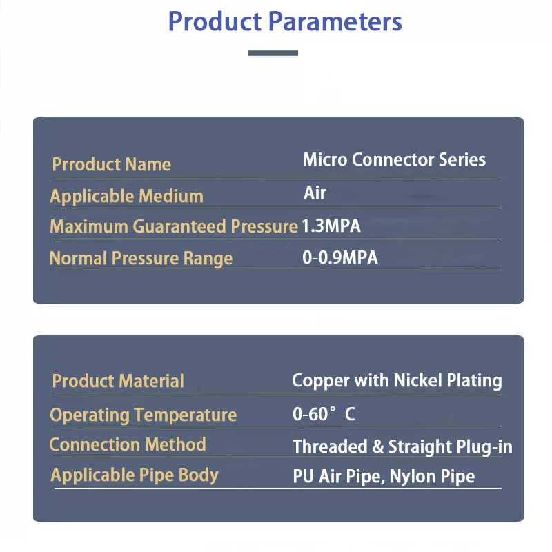 Het tolerantiebereik van de Micro Mini Connector-serie zelf ligt in het temperatuurbereik van 0-60°C. Bovendien kan de maximaal gegarandeerde druk 1,32 MPa bereiken en is het normale werkdrukbereik 0-0,9 MPa. Dit omvat volledig de stabiele werking van pneumatisch gereedschap, geautomatiseerde cilinders en andere apparatuur die werkomstandigheden onder hoge druk vereisen. Het ontwerp van de Micro Mini Connector-serie kan nauwkeurig voldoen aan de behoeften van industriële activiteiten en kan worden aangepast aan PU-trachea- en nylonbuizen, die reguliere buizen op de markt zijn. Het ontwerp van deze serie producten zorgt voor een uitstekende afdichtingsfunctie. Afgaande op het algemene ontwerp van het product is het verbindingsmateriaal gemaakt van een vernikkeld koperen kleplichaam. Het vernikkelde kopermateriaal heeft niet alleen de uitstekende afdichting van kopermateriaal, maar ook de goede corrosieweerstand van de vernikkelde laag, zodat het het werk lange tijd kan volhouden, zelfs in een vochtige of stoffige omgeving. De stabiliteit van het werk is niet gemakkelijk te roesten, wat de stabiliteit van de verbinding beïnvloedt. Het interieur is voorzien van een speciale concave afdichtring, die een groter contactoppervlak heeft, zodat de pasvorm hoger is en de afdichting sterker is. Tegelijkertijd is het product zelf ontworpen met de standaard R-draad van de algemene industriële draad. Tegelijkertijd vermijdt de combinatie van de standaard R-schroefdraad en de interne borgveer slijtage en lekkage veroorzaakt door het loskomen van onderdelen, wat een dubbele bescherming aan het afdichtingswerk kan toevoegen, wat ook betekent dat de levensduur van het product aanzienlijk wordt verlengd. Ten slotte is de schroefdraad van de Micro Mini Connector-serie vooraf gecoat met PTFE-lijm. Het materiaal van tetrafluorethyleen zelf heeft een zeer goede chemische stabiliteit en een zekere smering, wat betekent dat het niet alleen het afdichtende effect van de schroefdraad kan optimaliseren, maar ook tot op zekere hoogte kan verminderen. Minder draadslijtage verlengt de levensduur van het product verder. Van het materiaal tot het ontwerp moet de Micro Mini Connector-serie een goede afdichting bereiken, zodat onder de hoge druk werkomstandigheden van het pneumatische systeem zelfs hoogfrequent werk het afdichtende effect van "druppelbestendig" kan behouden.