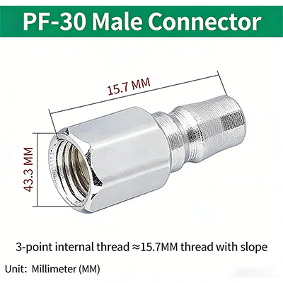 2. PF-30. Britse pijpdraad G3/8", met schroefdraadhelling, de diameter van het schroefdraadgedeelte is ongeveer 15,7 mm en de totale lengte van het product is 43,3 mm.