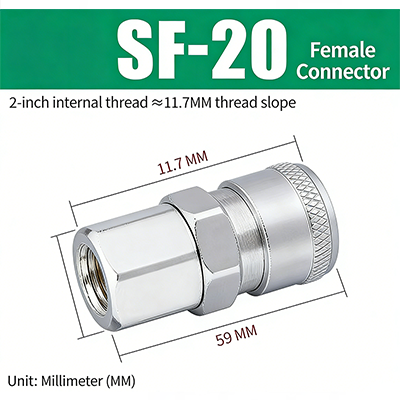 1. SF-20. De imperiale pijpdraad is G1/4", de diameter van het schroefdraadgedeelte is ongeveer 11,7 mm en de totale lengte van het product is 59 mm.