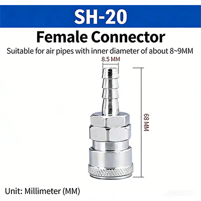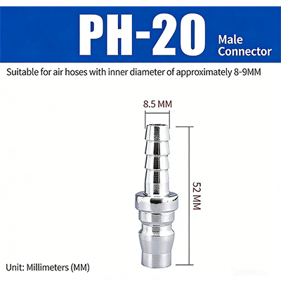 1. PH-20. Het is geschikt voor luchtpijpen met een binnendiameter van ongeveer 8-9 mm. De diameter van het uiteinde van de connectorbuis is 8,5 mm en de totale lengte is 52 mm.