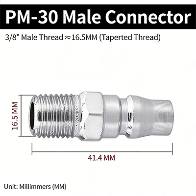 2. PM-30. De 3/8-inch buitendraad is een conische externe draadstructuur. Draaddiameter: 16,5 mm en de totale lengte is 41,4 mm.