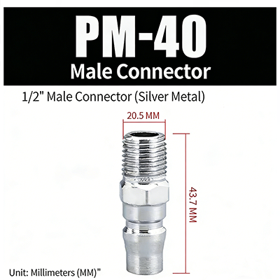 3. PM-40. 1/2-inch mannelijke connector, de draaddiameter is 20,5 mm en de totale lengte is 43,7 mm.