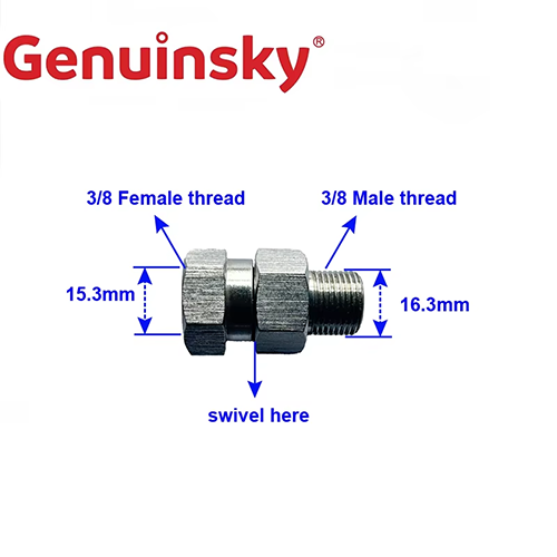 Deze roestvrijstalen zwenkaanpassing is 3/8 vrouwelijke draad aan één uiteinde, met een diameter van ongeveer 15,3 mm en 3/8 mannelijke draad aan het andere uiteinde, met een diameter van ongeveer 16,3 mm. In het bijzonder kan het middelste deel worden gedraaid. Deze functie kan worden aangepast aan de hogedrukslang en spuitpistool van auto-wasapparatuur. Bij de reinigingsbewerking kunnen verschillende hoeken worden aangepast volgens gebruik, die het probleem van pijpvervorming kunnen oplossen. Met de rotatiestructuur kan flexibele verbinding worden gerealiseerd.