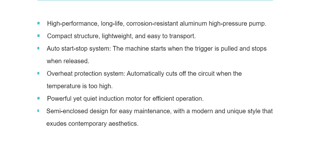 Ten tweede heeft de STG-ROCK-K draagbare hogedrukreiniger als geheel een compacte structuur en is het totale lichaamsgewicht zeer licht. Het nettogewicht van K3 is 10 kg en het nettogewicht van K4 is 12 kg, beide zijn uitgerust met het handvatontwerp aan de bovenkant, wat handig is. Gebruikers kunnen zich verplaatsen afhankelijk van hun schoonmaakbehoeften, van huis naar buiten. Tegelijkertijd is het apparaat ook uitgerust met intelligente functies zoals automatische start-stop en bescherming tegen oververhitting. Haal de trekker van het spuitpistool over om te starten en laat de trekker los om te stoppen. Er is geen handmatige schakelaar nodig, wat de bediening handiger maakt. Dankzij de oververhittingsbeveiliging kan het apparaat het circuit automatisch uitschakelen wanneer de temperatuur te hoog is, overbelasting voorkomen die schade aan de machine veroorzaakt, de algehele veiligheid verbeteren en het product veiliger en zorgeloos maken tijdens gebruik. Het semi-gesloten ontwerp van de romp is ook zeer gehumaniseerd, wat handig is voor dagelijks onderhoud, en gemakkelijk onderdelen kan controleren en het filter kan reinigen.