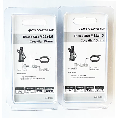 De 1/4 koppeling van deze twee specificaties heeft verschillende maatvoeringen. Eén is M22×1,5, met een diameter van 22 mm, waarvan de kern dia.15 mm. De andere is M14×1,5, met een diameter van 14 mm en een taps gat. Het ontwerp van de twee maten van het product is zeer nauwkeurig, wat nauwkeurig kan worden aangepast aan de relevante bijpassende reinigingsmachines en kan worden gebruikt voor slangaansluitingen voor hogedrukwaspistolen. Het materiaal van het product zelf is messing. Het messingmateriaal heeft een goede corrosieweerstand. Hogedrukreinigingswerkzaamheden hebben vaak te maken met een vochtige omgeving. Daarom kan de corrosieweerstand van het product zelf normaal werken in veel zware werkomgevingen. Tegelijkertijd heeft messing een goede ductiliteit en hardheid, en bij waterstroming onder hoge druk kan de duurzaamheid van het product zelf ook behouden blijven bij impact, en het is niet gemakkelijk te breken, waardoor waterlekkage ontstaat en de kosten voor het vervangen van de apparatuur worden verlaagd. Veel voorkomende gebruiksscenario's zijn onder meer het schoonmaken van huizen, het schoonmaken van industriële apparatuur of het schoonmaken van buitenfaciliteiten. Tijdens deze reinigingsprocessen kan de montage of demontage snel worden uitgevoerd. Gebruikers kunnen de verbindingswerkzaamheden snel voltooien zonder hulp van gereedschap, wat de werkefficiëntie aanzienlijk verbetert en tijd bespaart. Tegelijkertijd is de maat van de 1/4 koppeling van deze twee specificaties ook zeer geschikt. Gebruikers kunnen de aansluithandeling eenvoudig en flexibel met één hand voltooien.